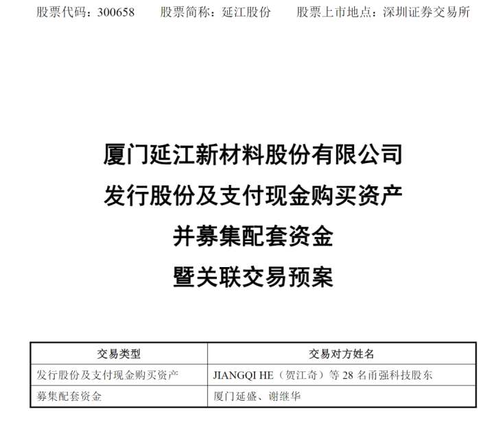 1月18日晚间,延江股份(300658)披露重组预案,公司拟通过发行股份及支付现金的方式,向JIANGQIHE(贺江奇)等共28名交易对方购买甬强科技98.54%的股权,同时向公司实控人控制的厦门延盛及公司实控人之一谢继华发行股份募集配套资金。