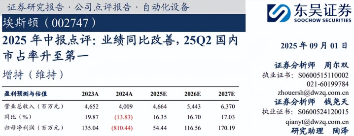 因此或许也是不得已,东吴证券的这位分析师周尔双,在2025年9月拉上了另外一位分析师钱尧天,一起发布了埃斯顿2025年中报点评,将2025年全年利润展望降至5000多万元,对2026年的利润展望也降至1.17亿元,不及一年前预测数据的一半。